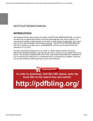 Read Online sketchup the missing manual Reader online is a convenient and frugal way to read sketchup the missing manual you love right from the comfort of your own home. Yes, there sites where you can get Reader "for free" but the ones listed below are clean from viruses and completely legal to use.
